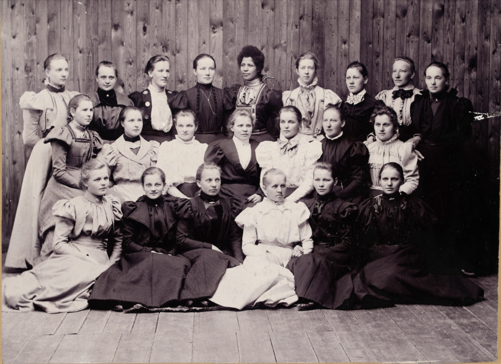 Description: Photograph of the Sortavala Teachers’ College Women’s Choir. Rosa Emilia Clay, standing at centre in the back row, was born in Omaruru, Namibia, in 1875. Her guardians, the Finnish missionaries Karl and Ida Weikkolin, brought her to Finland in 1880, where she remained and as a young woman studied to become a primary school teacher at the Sortavala Teachers’ College. She graduated the year after the photograph was taken, and in 1899 she became the first African woman to receive Finnish citizenship. She emigrated to the United States in 1904, where she remained active in the Finnish immigrant community. She married theatre director Lauri Lemberg and is known in Finnish-American sources as Rosa Lemberg, although she later divorced him. A biography in Finnish, Arvo Lindewall’s Rosalia (Yonkers, NY: Kansallinen Kustannuskomitea, 1942), was published during her own lifetime, and in 2020 a public square in Tampere was officially named after her [can we link this directly to the WG2 map card?].