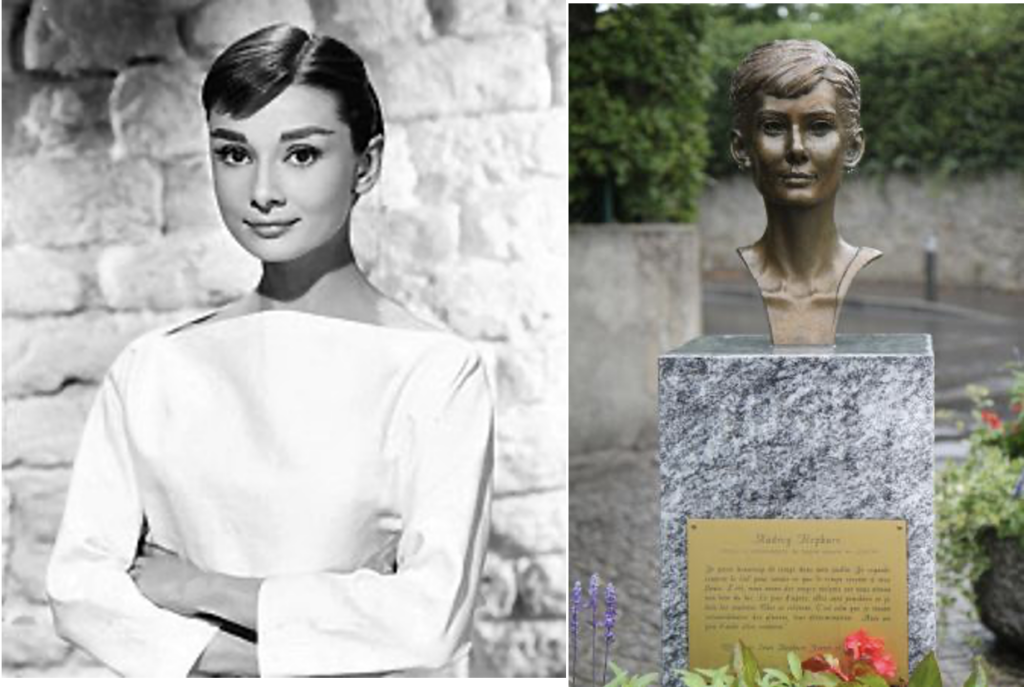 The monument is placed in the Audrey Hepburn Square in Tolochenaz, Switzerland. The bust of the actress was donated by her sons to the town of Tolochenaz in 2012.