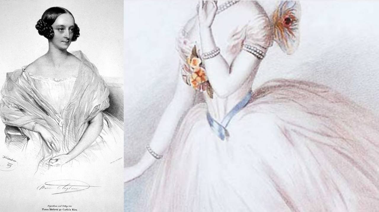 Marie Taglioni (b. Stockholm, Sweden, 1804 – d.1884, Marseille, France) comtesse de Voisins, was a Swedish-born ballet dancer partially of Italian descent, a central figure in the history of European dance. She is credited with (though not confirmed as) being the first ballerina to truly dance en pointe. Taglioni came from a family of artists and she moved to Vienna during infancy, where she was trained and had her first debut. Before joining the Paris Opera, Taglioni danced in Munich and Stuttgart, and in 1837 she signed a 3-year contract with the Imperial Ballet in Saint Petersburg. Taglioni made several tours in Europe and retired from performing in 1847. She had residences in Venice, later in London and finally in Marseille, where she died.