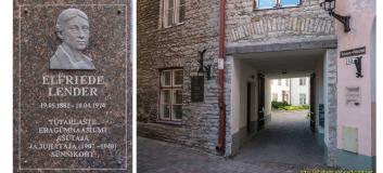 On 16 November 2010, Estonian sculptor Aime Kuulbusch-Mölder’s memorial black granite plaque dedicated to Elfriede Lender was unveiled on the wall of her childhood home at Toom-Rüütli 12 in Toompea, Tallinn. In 2017, a plan was finalised to place a Lender memorial with two benches in the Police Garden, one of which will be occupied by Elfriede Lender and the other by her husband Voldemar, the first Estonian mayor of Tallinn.
