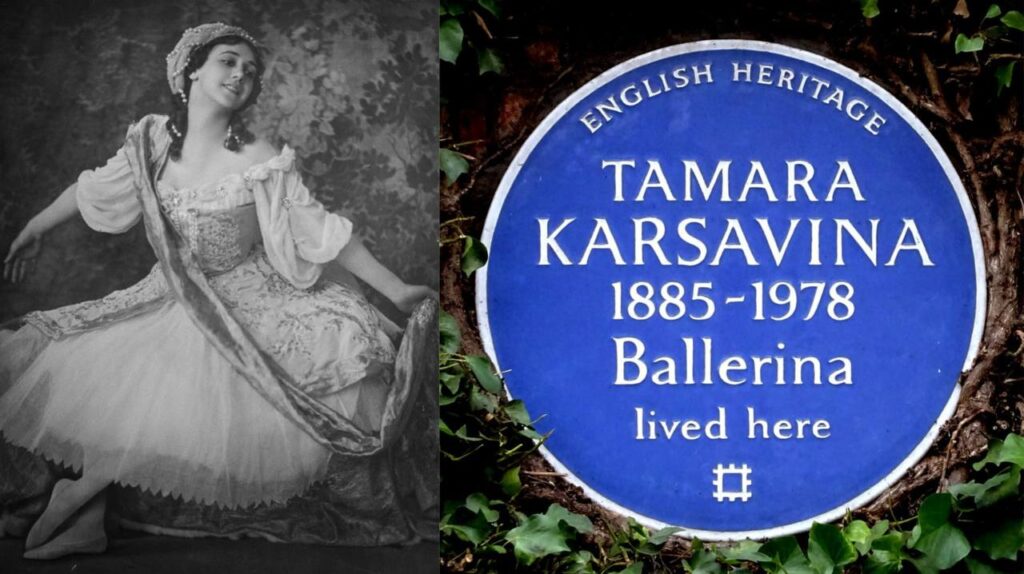 Tamara Platonova Karsavina (b. St. Petersburg, Russian Empire, 1885 – d. 1978, Beaconsfield, UK) was a Russian ballerina who settled in Britain. She began teaching ballet professionally and became recognised as one of the founders of modern British ballet. She assisted in the establishment of the Royal Ballet and was a founder of the Royal Academy of Dance. She married British diplomat Henry James Bruce and left Russia before the Red Terror. Karsavina went to Paris with the Ballet Russes and moved to London from 1918. She stayed in the UK until her death in 1978. Her grave in Hampstead Cemetery, in the London Borough of Camden says »Whosoever Believeth in Me Shall Never Die ».