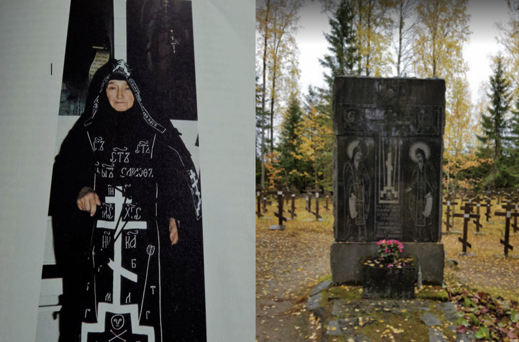 Schema-nun Serafima (Maria Smirnova) (b. Moscow, Russia 1901 – d. 1986, Heinävesi, Finland) was born to a Russian noble family. Maria learnt French and Dutch at a young age and she went on to study at a school for noble maidens in St. Petersburg. Maria was a gifted student and she often played the piano at school parties. The members of the Tsar Family sometimes attended these events and heard her play. Maria’s father passed away during the Russian revolution and her mother sent 18 years old Maria and her 12-year-old brother to Finland. In Finland, Maria worked as doctor’s assistant and went to school in Karelian Isthmus where she found her husband, who later proved to be unfaithful. Maria sought help from her unhappy marriage at Lintula monastery, where she was secretly ordained a nun and granted the permission to divorce from her husband. After divorce, Maria moved to Lintula monastery with her daughter Natasha. When the winter war broke out Maria fled to Kuopio and worked as a mail carrier to support her family. In the 1950s she lived in Uusimaa where she helped to take care of her daughter’s twins. In 1961, Maria moved to Lintula monastery in Heinävesi. In Heinävesi she tended the monastery’s kitchen and participated in the life of the monastery with other nuns. She was also ordained a Schema-nun and given the name Serafima in Lintula monastery. There are other graves of refugee nuns at Lintula monastery’s graveyard.