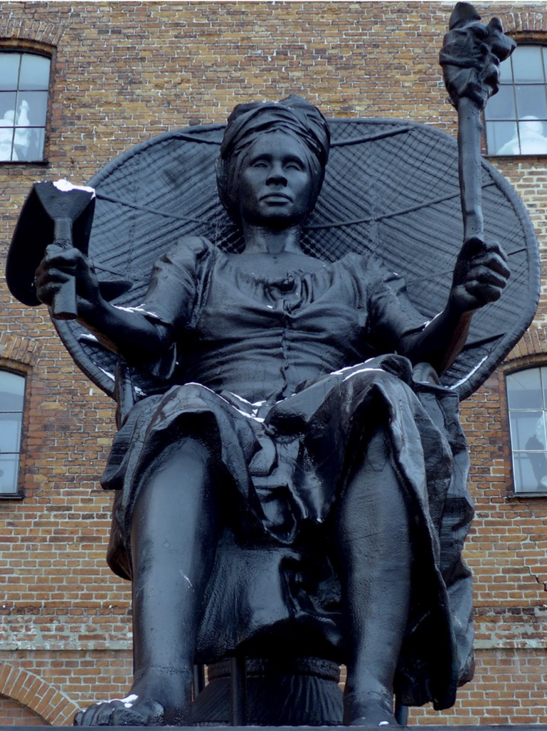 Mary Thomas (b. 1848, Antigua, Antigua-and-Barbuda – d. 1905 , Christiansted, Virgin Islands) was a black slave who, along with two other women, led an uprising called the “Fireburn” in the Danish colonies (St Croix) in 1878. Because of her leading role in the riot, she was nicknamed Queen Mary. In 1882, Mary Thomas was transferred to Copenhagen and placed in the Women’s Prison, Christianshavn. However, in 1887 she was sent back to Christiansted, St. Croix, where she served the rest of her sentence. In 2018, the artist team La Vaughn Belle and Jeannette Ehlers created the 7-meters high sculpture monument called “I am Queen Mary” as a commemoration of the resistance of the Danish colonial impact in the Caribbean. It is also Denmark’s first public monument dedicated to a black woman.