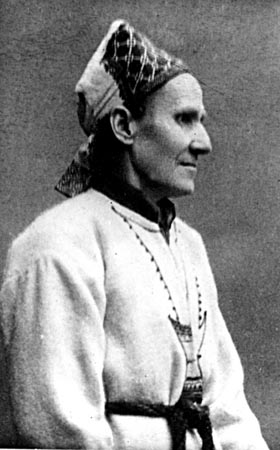 Larin Paraske (Paraskeva Nikitina) (born Lempaala, Ingria 1833, – died 1904, Metsäpirtti, Finland) was a traditional singer with Ingrian background. The largest singular corpus of old Finnish-Karelian poetry in the traditional Kalevala metre, 32 000 lines of verse, are known and recorded thanks to her. Larin Paraske’s life was characterized by poverty and the early death of her parents. After moving and marrying to the Finnish side of the border in Karelia she and her husband tried to make a livelihood with their small farm, collecting woods and caring for the orphans. Singing was part of her life and she learned traditional songs from several areas and villages. Pastor Adolf Neovius (1859–1913) discovered her talent in 1887 and started to record her songs, a work that lasted for eight years and which led to Paraske’s moving to Porvoo with Neovius. She co-operated also with several other folk-poetry collectors as well as with the composer Jean Sibelius (1865–1957) and artist Eero Järnefelt (1863–1937) which sealed her legacy as an icon of Finnish-Karelian oral culture.